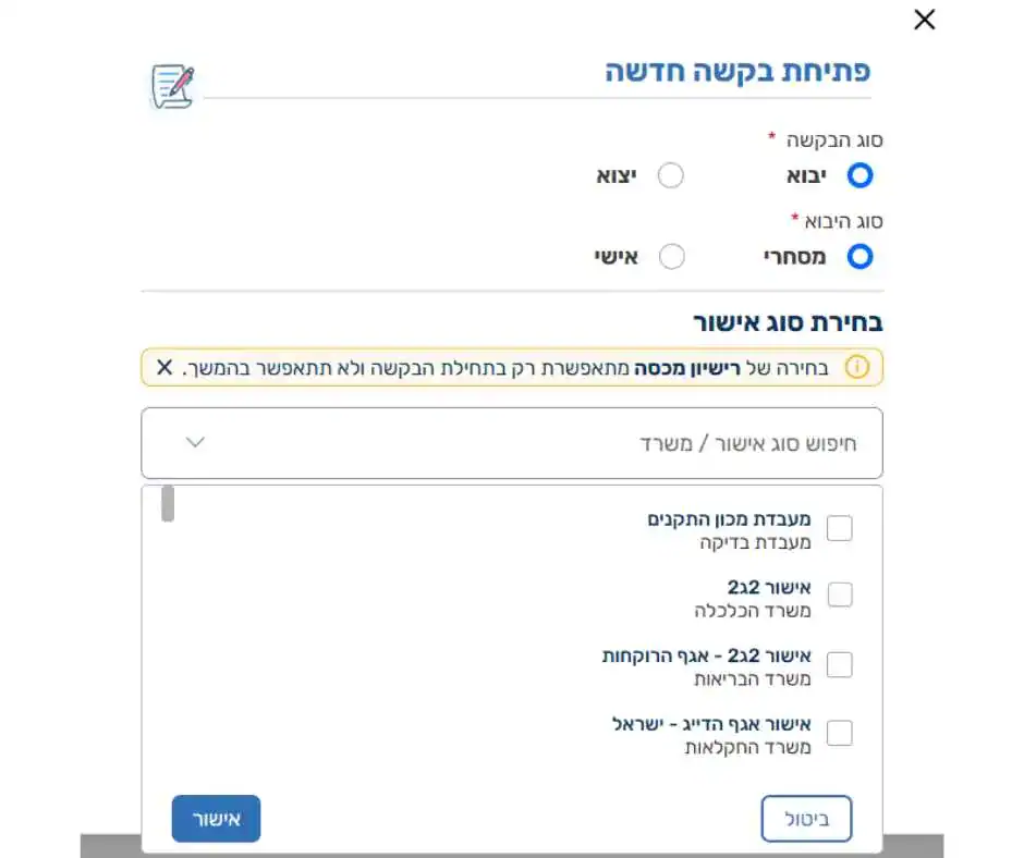 בלחיצה על "הוספת סוג אישור" במסך הקודם, תיפתח לכם החלונית הבאה מצד שמאל.