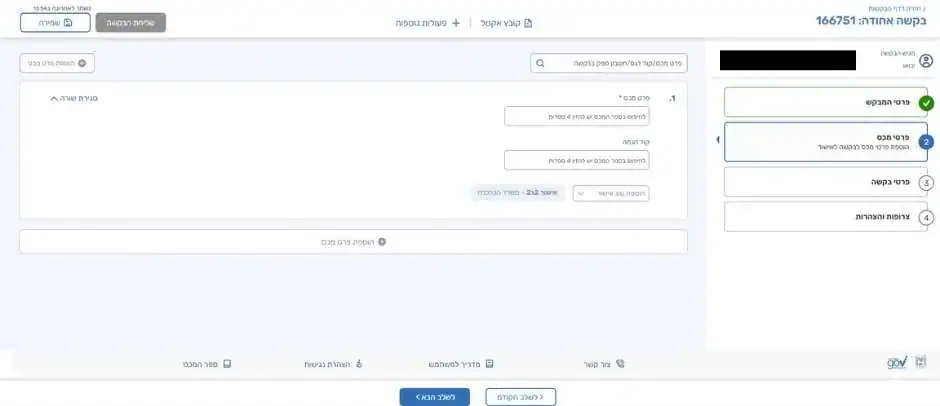 במסך זה יש לציין האם המוצר משומש, האם הבקשה מוגשת לאחר שהיבואן נתפס בעבירה ואזור השימוש של הטובים.