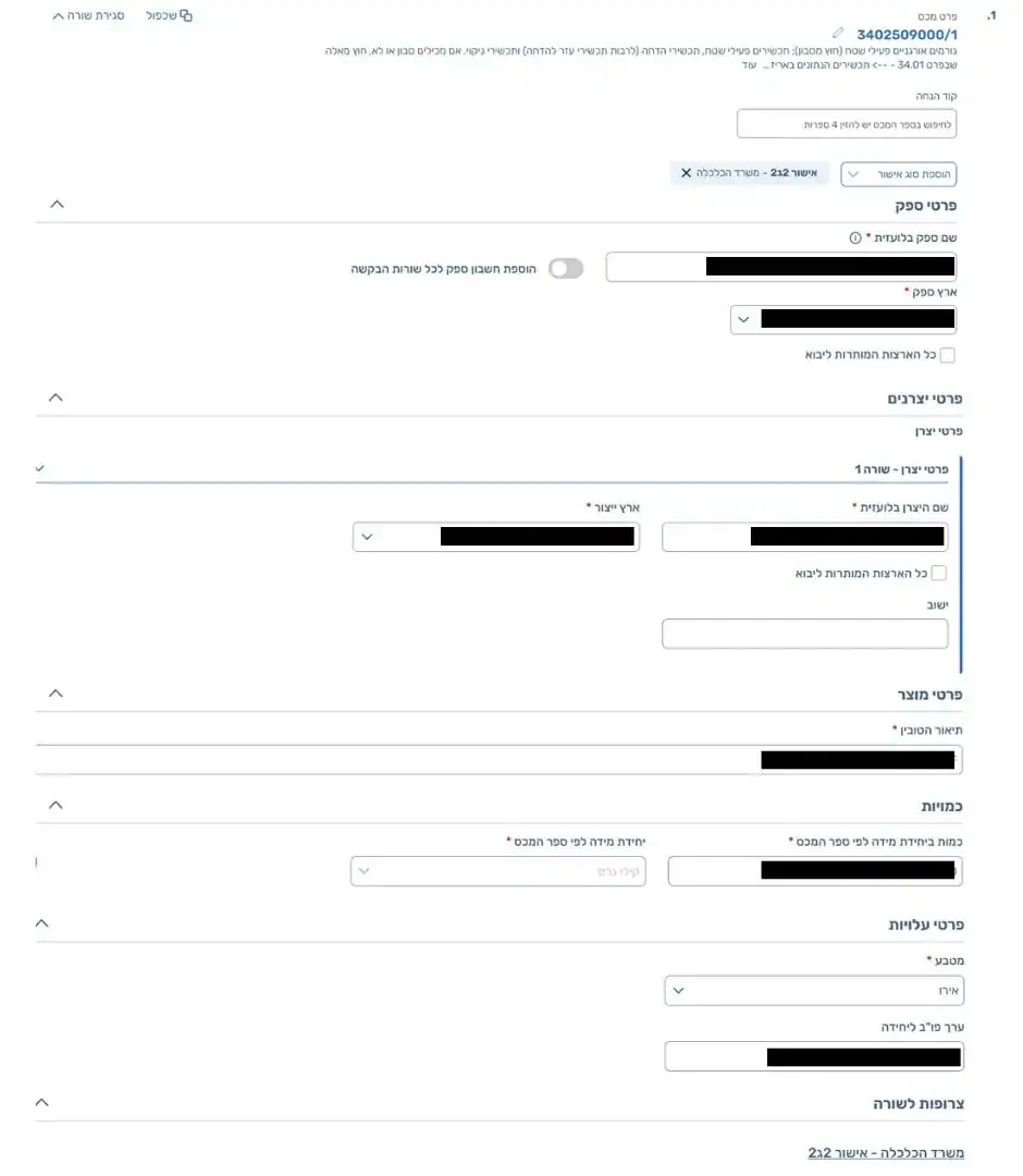 במסך זה יש להזין את פרטי הספק ומדינתו, פרטי היצרן ומדינת הייצור ופרטי הטובין המיובאים, הכמות והעלות.