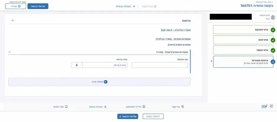המסך האחרון בהגשת הבקשה: כאן תוכלו לצרף מסמכים התומכים את הבקשה.